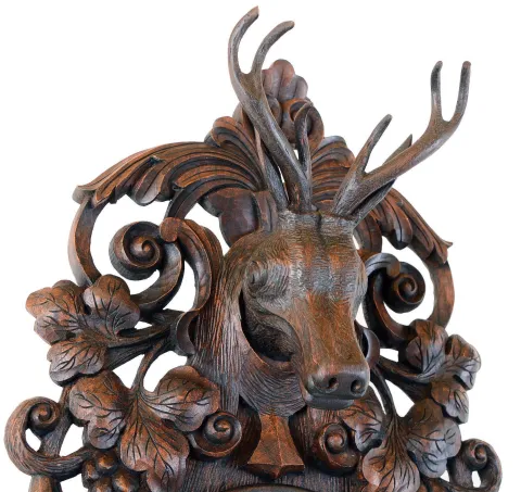 Vienna regulator wall clock, 8 day, time and strike, weight driven movement in an bench made carved case surmounted by deer head, movement circa 1870, case 20th century