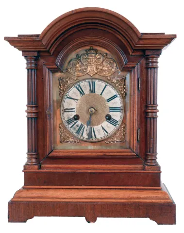 Germany, bracket clock, unsigned, 8 days, time and strike, spring driven movement in walnut arch topped case with 3/4 columns and brass dial with silvered chapter ring.
