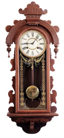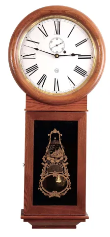 Clocks- 3 (Three) Asian modern reproduction 8 day wall clocks: Seth Thomas early style oak No. 1 or No. 2 Regulator reproduction, 8 day weight driven; large Korean mahogany ornate time and strike with "N" trademark on painted metal dial; large Korean time and strike with drop finials; late 20th century all three are in nearly as-new condition, but were not tested and are sold as is with no further details available. Largest Ht 40 in