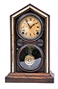 Clocks- 2 (Two): (1) Seth Thomas Clock Co,, Thomaston, Conn., "Chime Clock No. 60" tambour mantel clock with a 8 days spring driven time and Westminster strike movement in a mahogany case. c1935. (2) E. Ingraham & Co., Bristol, Conn., "Doric. Extra" with optional gilt band, mantel clock with an 8 day spring driven time and strike movement in a rosewood veneered case, c1880. (1) The case retains a soft original finish. The dial and hands are original and in excellent condition. The clock uses the no. 124 movement. Overall a very clean example of this model. Ht, 9.5". (2) The original finish is retained but has worn in spots. The gilt columns also show signs of wear. The paper dial has aged. The hands are correct. Both of the door glasses are original. This visible pendulum model had no painted tablet, but a fancier pendulum which is original, but missing its two leaves which draped over the bob. Good Ingraham label on the case back.