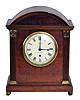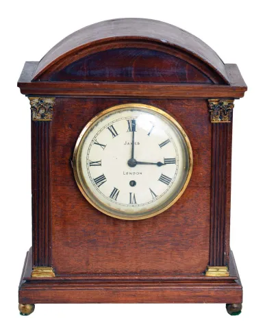 English, 8 days, spring brass fusee movement with a drop off strike mantel clock. Mahogany and mahogany veneered case with a patched hole and a small veneer repair on the front, a ding on the base and damage to the left side molding. Original painted dial is stained with minor loss on the edges. Original hands. Cloth behind the side grills has deteriorated.