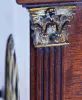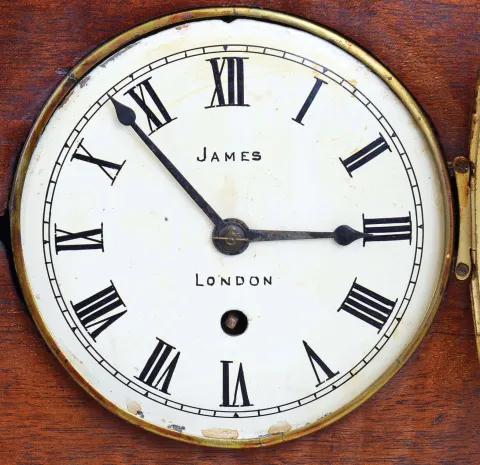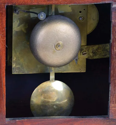 Mahogany and mahogany veneered case with a patched hole and a small veneer repair on the front, a ding on the base and damage to the left side molding. Original painted dial is stained with minor loss on the edges. Original hands. Cloth behind the side grills has deteriorated.