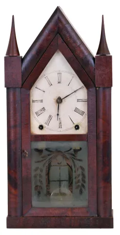 Brewster & Ingrahams, Bristol, Conn., 8 day "Sharp Gothic" or "steeple" clock with very nice cut glass tablet.