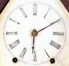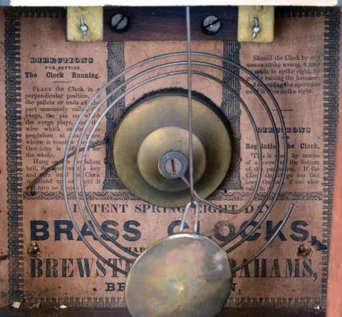 Brewster & Ingrahams, Bristol, Conn., 8 day "Sharp Gothic" or "steeple" clock with very nice cut glass tablet. Mahogany veneered case with some nicks and replaced veneer on the right side of the peak. Spires are correct type, but don't seat well. The dial is original, but very dirty with wear and some loss. Original hands and pendulum bob. Ribbed plate movement with huge steel springs is very dirty and complete except that the striking hammer is missing. This is the model that used the striking hammer to actuate and correct the strike.