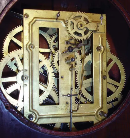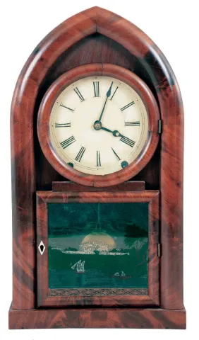 Brewster & Ingrahams, Bristol, Conn., 8 day, time and strike spring brass movement round Gothic or "beehive" shelf clock. Refinished mahogany veneered case in very nice condition with a small ding at the door lock. Original painted dial with some wear and minor loss at the mounting screws. Bottom tablet with some loss looks original, but has been out of the case. Hands are little unusual, but look original. Label is dark, but readable. Movement is signed.