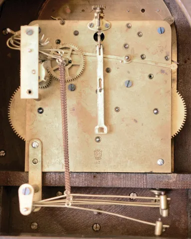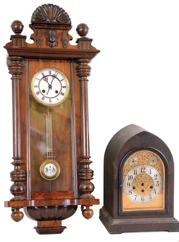 Clocks- 2 (Two) 8 day: Seth Thomas Westminster "Chime Clock No. 72" bracket clock and a German R/A time and strike wall clock; early 20th century the chime clock has a detached No. 113 movement with missing components, and there are loose parts in the case. The ornate dial is very nice; the original case finish is worn. The R/A movement is unsigned, and its bottom finial and a side molding are absent. Otherwise, its condition is very good, with nice white enamel on the dial and pendulum bob. Ht of R/A is 33 in, chime clock is 15 in