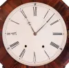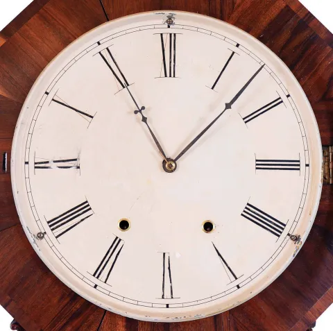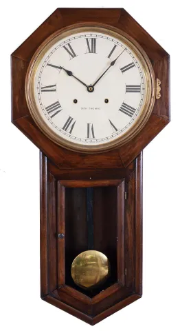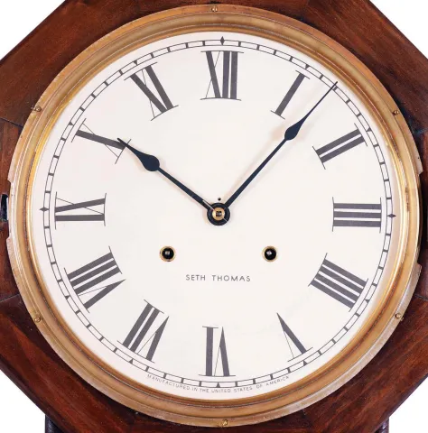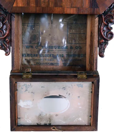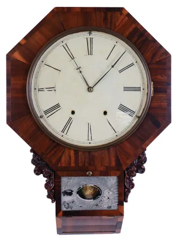 Clocks- 2 (Two): (1) Seth Thomas Clock Co., Thomaston, Conn., "Globe" 8 day, time and strike spring brass movement drop octagon wall clock. c1913 (2) William C. Vosburgh & Co., New York, 8 day, time and strike spring brass movement drop octagon wall clock. c1855 (1) Refinished mahogany and mixed woods case in need of repair. The case bottom has separated and will need attention along with the door bottom. The left front and side piece that makes up the frame for the door are cracked at the end. Original dial pan now has a paper dial. Original hands and pendulum. Ht 32" (2) Rosewood veneered case is clean in an old and possibly original finish has a little lifting of the veneer just above the bottom door. Original painted dial has some loss at the mounting screws and little wear. Hour hand is original. Minute hand is a replacement. Original movement looks to be by the New Haven Clock Co. Original tablet has some loss. Original cast side pieces. Clean label inside the case. Ht 24.5"