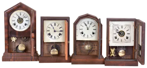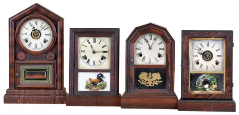 Clocks- 4 (Four): (1) William L. Gilbert Clock Co., Winsted, Conn., "Gem" 8 day, time, strike and alarm spring brass movement cottage clock. c1875 (2) Atkins Clock Co., Bristol, Conn., 8 day, time and strike spring brass movement octagon top cottage clock. c1875 (3) E. Ingraham & Co., Bristol, Conn., "Argand" 8 day, time, strike and alarm spring brass movement cottage clock. c1880 (4) Ansonia Clock Co., New York., 8 day, time and strike spring brass movement cottage clock. c1880 (1) Rosewood veneered case in original finish with some loss on the base. Original painted dial has a little wear. Original hands and tablet. Ht 17" (2) Rosewood veneered case in original finish with couple dings and scraps. Clock now has a paper dial. Original hands and tablet. Ht 14.5" (3) Mahogany veneer and faux grained case in original finish with some dings and scraps. Original painted dial, hands and tablet. Some wear to the gilt door molding. Ht 13" (4) Mahogany veneered case in original finish with couple veneer chips. Original painted dial, hands and tablet. Ht 13.25"