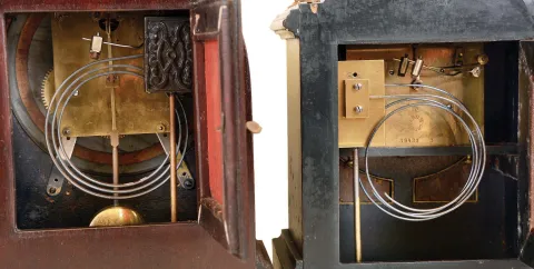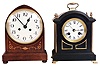 Clocks- 2 (Two): (1) German, 8 days, time and strike spring brass movement mantel clock. (2) German, 8 days, time and bim-bam strike spring brass movement mantel clock in the form of a bracket clock. (1) Refinished mahogany and inlayed mahogany veneered case in nice condition. Original porcelain dial is perfect. Original hands and pendulum. Ht 12.5" (2) Ebonized mahogany case in original finish with some dings and scratches. Repainted metal dial could be a replacement has the winding and center holes are a little large. Period hands. Ht13.5"
