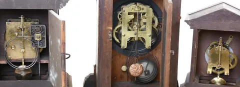 Clocks- 3 (Three) 8 day hardwood case mantel clocks: Two German (one timepiece, one striking): by Junghans; One English time, strike & alarm by Fattarini & Sons, time, strike and alarm; early 20th century
