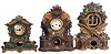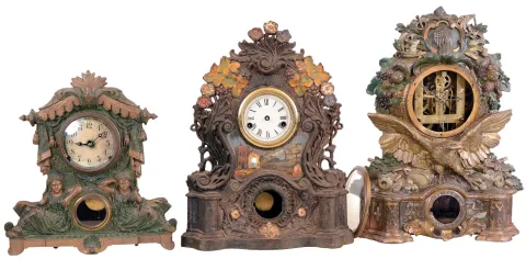 Clocks- 3 (Three) Metal Front Mantel: one painted iron front by F. S. Otis, Forestville, CT; two spelter front by Nicholas Muller (No. 163 "Study" and No. 54 "Eagle") , New York, NY. 8 day time and strike movements; c1870