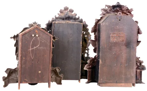 Clocks- 3 (Three) Metal Front Mantel: one painted iron front by F. S. Otis, Forestville, CT; two spelter front by Nicholas Muller (No. 163 "Study" and No. 54 "Eagle") , New York, NY. 8 day time and strike movements; c1870 the painted surfaces are old and probably original, and each has its original interior paper label. One has no dial and a detached bezel. One has no hands or top glass. Two are missing their lower doors. The two paper dials are later. Ht of tallest 18.5 in