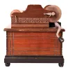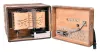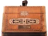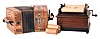(1) Walnut case 12" wide, 10" deep and 10.25" tall has an ebonized base molding and is in good condition with finish scuffs on left side. No. 302 penned on bottom, but no maker's name, although a paper label gives a New York name and address to write for a replacement broken reed. It plays well and loudly, though it is missing a sound box or enhancer (perhaps an option) which fitted into slots in the upper sides and bridged above the roll. Only one paper roll included. (2) The player concertina needs restoration and has serious veneer loss and metal surface deterioration on the case. It is 9": wide, 10.5" high and 11" deep. One end opens to reveal a 4.5" paper roll which is played by a key wound mechanism and apparently activated by lever. Squeezing the convertina supplies the air supply The buttons on the ends are for decoration only. The leather straps are poor replacements. The winding key is present, but the mechanism makes noise, but we are not sure it is working properly. A neat item and a restoration challenge for the brave and talented.