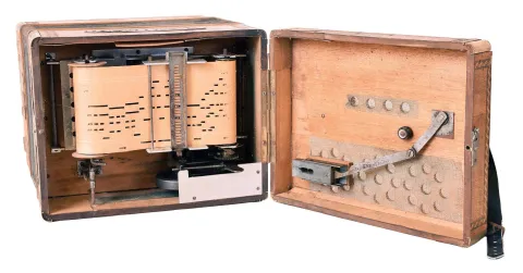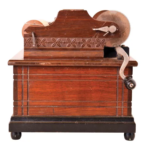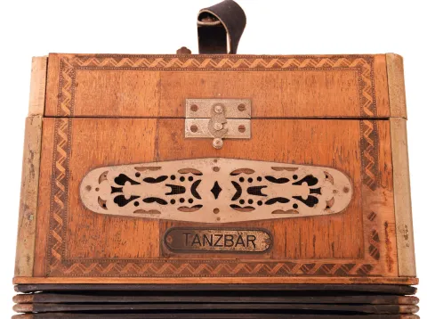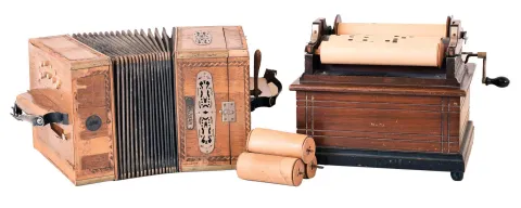 Two musical instruments. (1) An American-made roller organ with one 8" long paper roll. (2) A "Tansbar" player concertina made by A. Zuleger of Leipzig Germany with six 4.5 inch paper rolls.