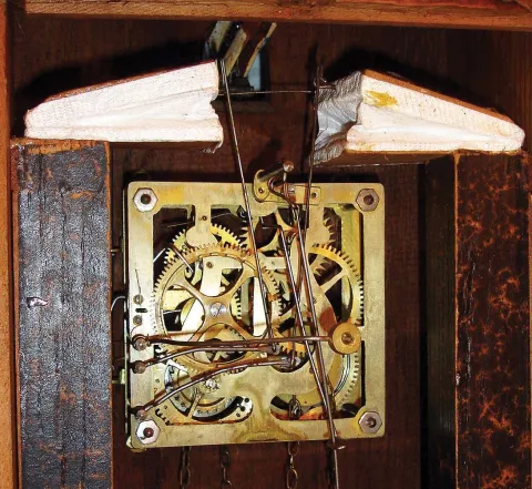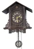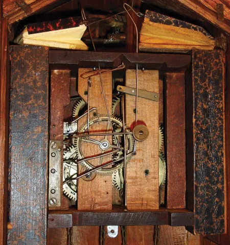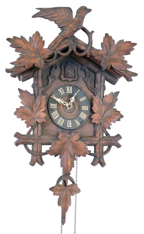 Clocks- 2 (Two) Cuckoo German Black Forest 30 hour 2 weight hanging clocks: (1) railway style with wooden plate movement, c1880; (2) with carved leaves and bird, cast metal plates; c1910 (1) wood plate model is missing its top fret, lower finials, IV on the dial, but is otherwise original and complete with nice bone hands, with a repaired pendulum stick. One bellows top is newer. (2) Cast metal plate clock has a nearly complete rear paper label with trademark. It retains an old finish and bone hands, has new bellows tops and a few very minor losses. The movements appear complete and functional, but were not tested. Both birds are hand painted wood with articulated wings and beaks. Only one weight comes with this lot. Case Hts overall 17 in and 14.5 in