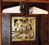 (1) wood plate model is missing its top fret, lower finials, IV on the dial, but is otherwise original and complete with nice bone hands, with a repaired pendulum stick. One bellows top is newer. (2) Cast metal plate clock has a nearly complete rear paper label with trademark. It retains an old finish and bone hands, has new bellows tops and a few very minor losses. The movements appear complete and functional, but were not tested. Both birds are hand painted wood with articulated wings and beaks. Only one weight comes with this lot. Case Hts overall 17 in and 14.5 in