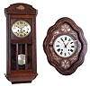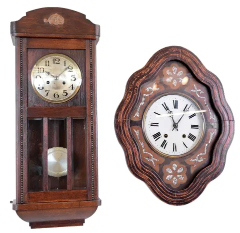 Clocks- 2 (Two) European 8 day time and strike spring-driven wall clocks: (1) French Morbier 8 day spring-driven "baker's clock" with mother-of-pearl inlay and reverse-painted glass dial; (2) German 8 day box regulator with two-tone striking; early 20th century (1) The baker clock's outer bezel has a worn finish and separation at the top; its dial has some minor paint issues at the edges and winding holes. Original hands. (2) The German clock has a damaged top medallion and its silvered dial is wearing to brass. The case has minor veneer losses, but its beveled and convex glasses are fine. Original hands and pendulum. Both movements are present and appear complete. Sold as is, no further details available. Ht of German clock is 31"
