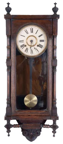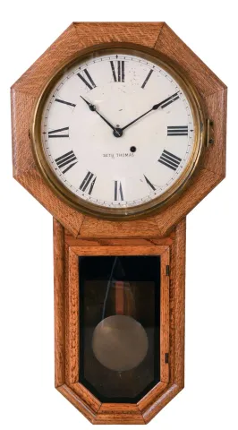 Clocks- 2 (Two): (1) Ansonia Clock Co., New York, NY,"Queen Elizabeth", 8 day, time and strike spring brass movement wall clock. c1885. (2) Seth Thomas Clock Co., Thomaston, Conn., "Globe" wall hanging clock with a spring driven 8 day timepiece movement in an oak case. c1909. (1) Oak case in original finish has dings, scratches and worn areas. Original paper dial is stained with some surface abrasion. Original hands, pendulum and finials. Top crest is missing. (2) The oak case has been lost its finish and needs stain and finish. The hands and dial are original as is the pendulum rod and bob. The movement is signed. The door glass is a replacement.