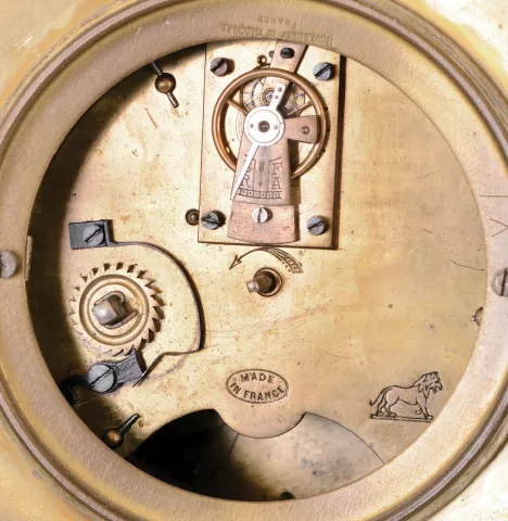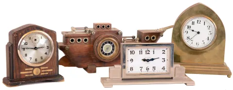 Clocks- 4 (Four) rear-wind time only desk clocks: Gilbert Art Deco style 30 hour with alarm; French 8 day brass with cylinder platform; New Haven 30 hour ship; Waltham nickel-plate 8 day Art Deco style; early 20th century all cases appear complete with worn original finishes. Dials and glasses are good. The New Haven ship is missing all its masts and rigging. The French platform ticks, but not the others. Its height is 7.75 in