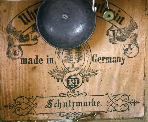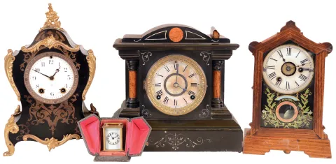 Clocks- 4 (Four): Philip Haas & Sohne German 30 hour time and alarm grain painted cottage clock; Seth Thomas black enamel wood 8 day time and strike mantel; Waterbury "Speck" 30 hour time only carriage clock with carrying case; and Seth Thomas black enameled wood Neuchatel style 8 day time and strike mantel; early 20th century the Neuchatel is missing it bezel and glass, and its dial has hairlines. The Seth Thomas black enamel is missing its back, and a side piece is detached. The German movement has a wheel visibly out of position, and has some dial flaking. The 3 in Speck is in very good condition, it ticks, but its carrying case may not be original to it. The two Seth Thomas movements appear complete but were not tested; all sold as is. Ht of tallest is 13.5 in