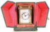 the Neuchatel is missing it bezel and glass, and its dial has hairlines. The Seth Thomas black enamel is missing its back, and a side piece is detached. The German movement has a wheel visibly out of position, and has some dial flaking. The 3 in Speck is in very good condition, it ticks, but its carrying case may not be original to it. The two Seth Thomas movements appear complete but were not tested; all sold as is. Ht of tallest is 13.5 in