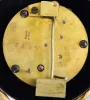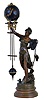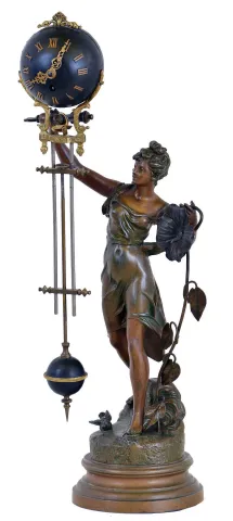 Swingers- 2 [Two] French, lot of small-medium ball style swing clocks, the movements contained within the brass spheres, suspended from the upraised arms of female statues. Larger figure is carrying a giant sea shell, the base signed "Reine des Flots, per Aug Moreau", smaller figure holds a large flower, unsigned. the smaller swinger has suspension unit in a plastic bag, as it was damaged in shipment [needs thin steel spring sections and a screw], however original blocks are there. This statue retains original patinated bronze finish over spelter. Arm length 16in The larger figure shows no evidence of repair, however was over-sprayed with bronze paint at some time, and there are additional scratches and paint chips. The movement arm is complete and suspension intact. Movements tick. Arm length 17in
