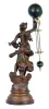 the smaller swinger has suspension unit in a plastic bag, as it was damaged in shipment [needs thin steel spring sections and a screw], however original blocks are there. This statue retains original patinated bronze finish over spelter. Arm length 16in The larger figure shows no evidence of repair, however was over-sprayed with bronze paint at some time, and there are additional scratches and paint chips. The movement arm is complete and suspension intact. Movements tick. Arm length 17in