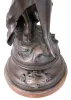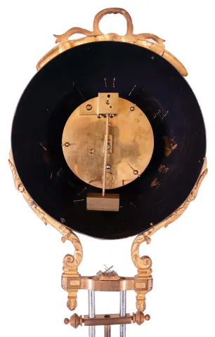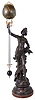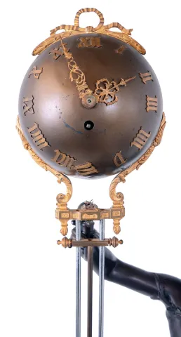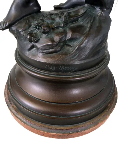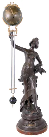 France, large mysterious ball swing clock, 8 days, time only, spring driven movement in extra long 35in grid 'pendulum' arm held aloft by the outstretched arm of "Les Marguerites", statue resting a marbleized wooden base. The statue and plaque bear the name of Aug. Moreau sculpture, the statue and ball are repainted. The suspension block is separate from the swinging arm. There is a small dent on the rear of the ball.