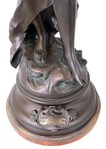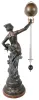 France, large mysterious ball swing clock, 8 days, time only, spring driven movement in extra long 35in grid 'pendulum' arm held aloft by the outstretched arm of "Les Marguerites", statue resting a marbleized wooden base. The statue and plaque bear the