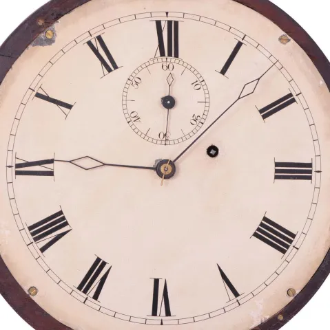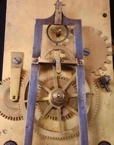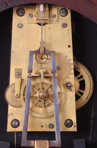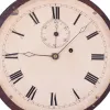 this interesting clock retains a very old finish. with some horizontal splits in veneer throat frame and several splits on door. The rating nut for th...