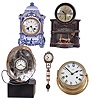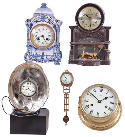 Clocks- 5 (Five): Mastercrafters "fireplace" electric, Schatz German 8 day marine with ship's bells, French in blue/white China case, illuminated seashell with "Eli Wallach" on small clock dial, and Junghans swinger (no base) ; all vintage