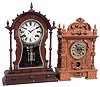 Clocks- 2 (Two) Connecticut 8 day time and strike mantel clocks: (1) Gilbert "Excelsior J" variant, in oak, c1905; (2) unsigned with N. Pomeroy movement. c1875. (1) The Gilbert has some resemblance to the "Excelsion J" shown in Ly, but this is an entirely different case and probably a premium model. The case appears original but refinished. A rear paper label remains, along with a Clear Lake, Iowa retailer's tag. (2) This model was probably sold by the American Clock Co. of New York, but the model has not been identified. The painted dial has considerable loss. The movements tick and strike but were not tested long term. Hts. 19.5 in and 23.5 in