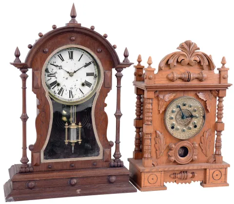 Clocks- 2 (Two) Connecticut 8 day time and strike mantel clocks: (1) Gilbert "Excelsior J" variant, in oak, c1905; (2) unsigned with N. Pomeroy movement. c1875.