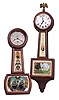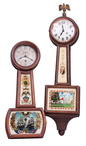 Clocks- 2 (Two): (1) Chelsea Clock Co., Boston, Mass., 8 day, spring lever movement miniature patent or banjo timepiece. Serial no. 48121, c1909. (2) Waltham Clock Co., Waltham, Mass., 8 day, spring lever movement miniature banjo timepiece. c1930