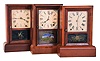 (1) Rosewood veneered case in original finish with some veneer damage on the base and a couple chips on the door corners. Dial is a replacement. Hands look to be a replacement. Original tablet with loss. Ht 14.5" (2) Mahogany veneered case in original finish with three veneer chips on the door. Painted dial is a replacement along with the hands. Original tablet. (3) Mahogany veneered case with remains of an old finish and heavy wear to the veneer on the door. Original painted dial has wear and loss at the winding arbors. Original hands and tablet. Ht 14.5"