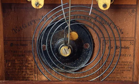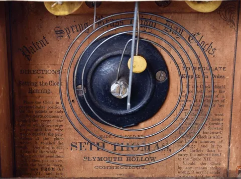 Clocks- 3 (Three): (1) Seth Thomas, Plymouth Hollow, Conn., 8 days, time and strike spring brass movement cottage clock. c1862 (2) Seth Thomas Clock Co., Thomaston, Conn., 8 days, time and strike spring brass movement cottage clock. c1880 (3) Seth Thomas Clock Co, Thomaston, Conn., 8 days, time and strike spring brass movement cottage clock. c1880 (1) Rosewood veneered case in original finish with some veneer damage on the base and a couple chips on the door corners. Dial is a replacement. Hands look to be a replacement. Original tablet with loss. Ht 14.5" (2) Mahogany veneered case in original finish with three veneer chips on the door. Painted dial is a replacement along with the hands. Original tablet. (3) Mahogany veneered case with remains of an old finish and heavy wear to the veneer on the door. Original painted dial has wear and loss at the winding arbors. Original hands and tablet. Ht 14.5"