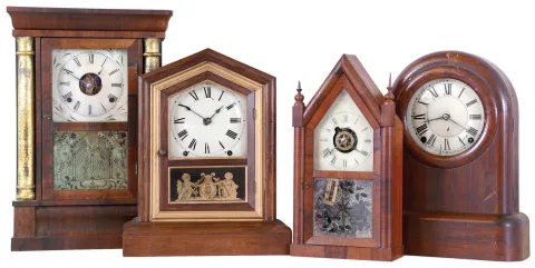 (1) The case has some original finish. The painted dial may have been restored. The hands are original. The door glasses appear to be original. The movement is signed. The pendulum bob is absent. Ht. 15.25in. (2) The case has some original finish with no veneer damage. The left finial has lost part of its tip. The original painted dial has faded with age. The hands are original. The door glasses are original, however the etched lower glass has faded. Ht. 14.75in. (3) The case has a nice old finish. There is veneer damage at the top of the door. The original painted dial has been repainted. The hour hand is correct but the minute hand is not. The movement is signed. the door has its original glass. The pendulum bob is absent. Ht. 15in. (4) The case is in nice condition with the exception of small veneer losses on the base sidepieces. Most of the finish is gone. The original painted dial has some restoration. The hands appear to be original. Both door glasses are original. The pendulum bob is absent. Ht. 18.25in
