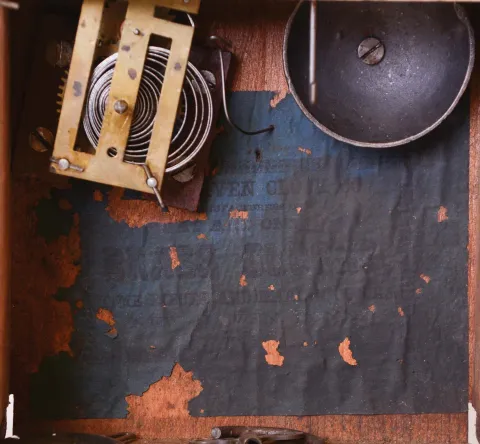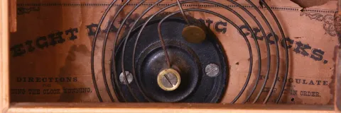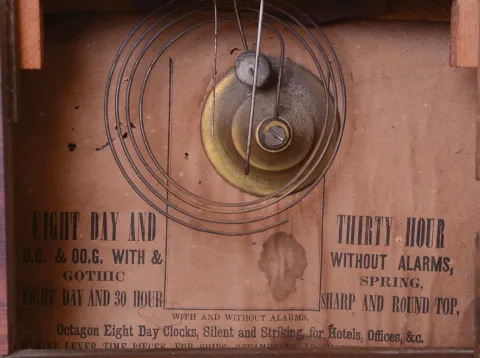 Clocks- 4 (Four): (1) Seth Thomas Clock Co., Thomaston, Conn., "Victoria" shelf clock with a spring driven 8 days time and strike movement in a rosewood veneered case. c1880. (2) New Haven Clock Co., New Haven, Conn., miniature steeple clock with a spring
