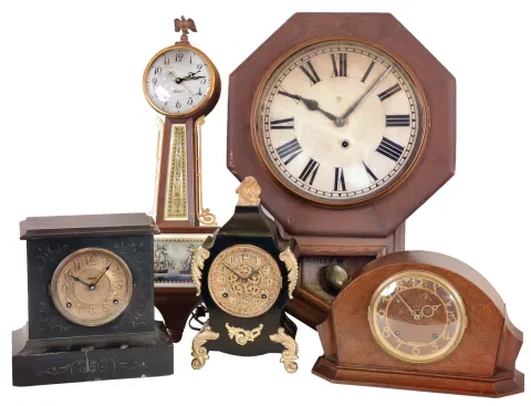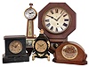Clocks- 7 (Seven) , plus a Crosby steam gauge Ingraham "Wizard" black enameled 8 day time and strike mantel; Ansonia time only 8 day school clock; Sessions plug-in electric banjo; Ansonia black enameled iron 8 day time and strike; Seth Thomas mahogany 8