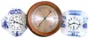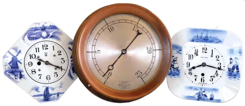 Clocks- 7 (Seven) , plus a Crosby steam gauge Ingraham "Wizard" black enameled 8 day time and strike mantel; Ansonia time only 8 day school clock; Sessions plug-in electric banjo; Ansonia black enameled iron 8 day time and strike; Seth Thomas mahogany 8 day mantel with bim-bam strike, dated 1947; two Delft plate time only wall clocks; 20th century sold as is, but mostly complete with original finishes. Not tested, no further information available. School clock Ht 24 in