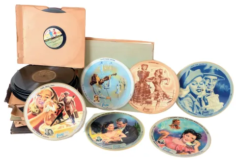 Lot of about 100 uncommon 78 rpm records including two Zonophone, eleven Pathe', two larger center hole, and collection of over 50 early single sided Victor records. Also some classics as the Preacher and the Bear, Two Black Crows, six Vogue picture records and a small group of early children's records, etc. Most need cleaning, but in good condition and playable.