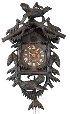 Cuckoo Clock, Black Forest, Germany, 30 hour carved dark-stained wood with two large birds with glass eyes, c1890 the carvings are bold and well executed, and there are only very minor tip losses and scratches, and the old finish retains some gloss. The cuckoo is nicely painted wood. The hands have darkened. The weights are absent. Ht without pendulum is 23 in