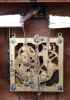 the carvings are bold and well executed, and there are only very minor tip losses and scratches, and the old finish retains some gloss. The cuckoo is nicely painted wood. The hands have darkened. The weights are absent. Ht without pendulum is 23 in