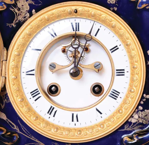 Clocks- 2 (Two) 8 day: French blue porcelain striking with visible escapement; Seth Thomas striking rosewood with columns and alarm the cobalt blue porcelain case is in excellent condition, although with a well-repaired rear foot, and its white enamel dial has small chip below the winding hole. Its movement has the Marti stamp, jeweled pallet pins, and striking on a bell. The Seth Thomas has been refinished, and has a new paper dial with short hands, but has a good interior paper label. All sold as is, no further information available