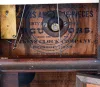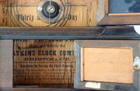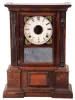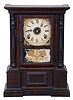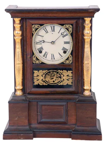 Clocks- 3 (Three): (1) Atkins Clock Co., Bristol, Conn., empty London model case. (2) Atkins Clock Co., Bristol, Conn., 8 days, time, strike and alarm spring brass movement London model shelf clock. (3) Atkins Clock Co., Bristol, Conn., 8 days, time and strike spring brass movement London model shelf clock. (1) Rosewood veneered case in an old finish. Case is separated on the right side. Left half column is inside the case. Dial pan has a later paper dial. There is no movement or pendulum with this case. (2) Rosewood veneered case in original finish has a small ding on the left side bottom molding. Original dial is repainted. Hands replaced. Remains of original decoration with losses to the background. (3) Rosewood veneered case in original finish has a small sliver of veneer missing the bottom front. Original painted dial has numerous inpainted areas. Original hands. Original glass decoration with slight background loss in the lower panel. Right gilt column has some slight loss.