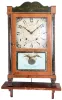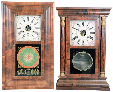 Clocks- 3 (Three): E. N. Welch Mfg. Co. Forestville, Conn., 30 hour, time and strike weight brass movement OOG shelf clock. c1875 (2) Waterbury Clock Co., Waterbury, Conn., "Column", 30 hour, time and strike weight brass movement column & cornice shelf clock. c1870 (3) Connecticut, Possibly an E. Terry & Sons, 30 hours, time and strike weight wood movement quarter column & splat shelf clock. c1830 (1) Refinished mahogany veneered case with loss and repairs on the outer band. Original painted dial with loss at the mounting pins. Hands maybe a replacement. Original tablet with some minor background loss. Clean label inside the case. Ht 26" (2) Refinished rosewood veneered case with a couple small veneer losses. Original painted dial with minor loss at the mounting pins. Original hands and tablet with the center area missing. Dark label inside the case. Ht 24.5" (3) Refinished mahogany veneered case with repairs on the base. Original painted dial has age darkened and is dirty. Hands and tablet are replacements Backboard and label are missing. Original stenciling on the columns. Top glass is cracked. One weight is missing Ht 28.75"