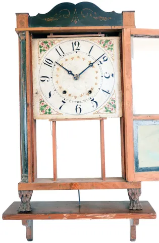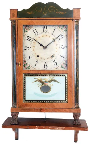 (1) Refinished mahogany veneered case with loss and repairs on the outer band. Original painted dial with loss at the mounting pins. Hands maybe a replacement. Original tablet with some minor background loss. Clean label inside the case. Ht 26" (2) Refinished rosewood veneered case with a couple small veneer losses. Original painted dial with minor loss at the mounting pins. Original hands and tablet with the center area missing. Dark label inside the case. Ht 24.5" (3) Refinished mahogany veneered case with repairs on the base. Original painted dial has age darkened and is dirty. Hands and tablet are replacements Backboard and label are missing. Original stenciling on the columns. Top glass is cracked. One weight is missing Ht 28.75"