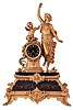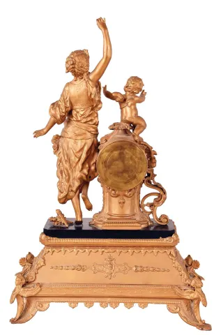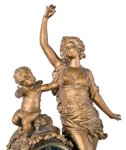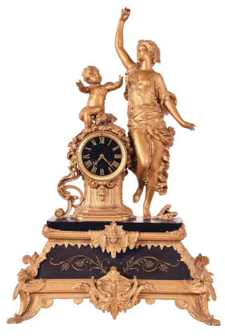 France, figural mantel clock, ,ornate, cast case with inset slate panel and top, supporting the two figures and clock case, Roman numeral black slate dial, gilt hands, 8 day time and strike pendule a Paris movement all gilt surfaces now painted gold, ornament at front of base cracked, rear right foot with loss, a few case components missing, dial good, with partial signature, hands good, ticks, striking not functional
