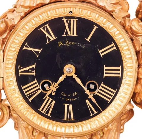 all gilt surfaces now painted gold, ornament at front of base cracked, rear right foot with loss, a few case components missing, dial good, with partial signature, hands good, ticks, striking not functional