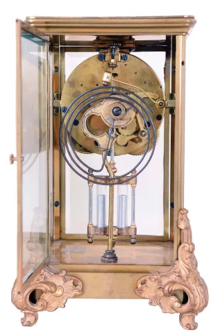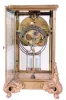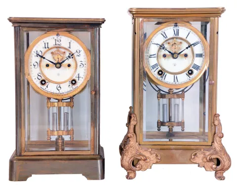 the "Marquis" shows the holes for the missing top pieces, one side beveled glass panel is broken, its inner dial is cracked, and its pallet jewels are mismatched. The "Prism" case is somewhat darkened and tarnished, but otherwise is in very nice condition. Both signed movements tick and strike but were not fully tested. Dimensions 11.5 x 7.25 x 6.5, and 10.75 x 6.25 x 5.24 in